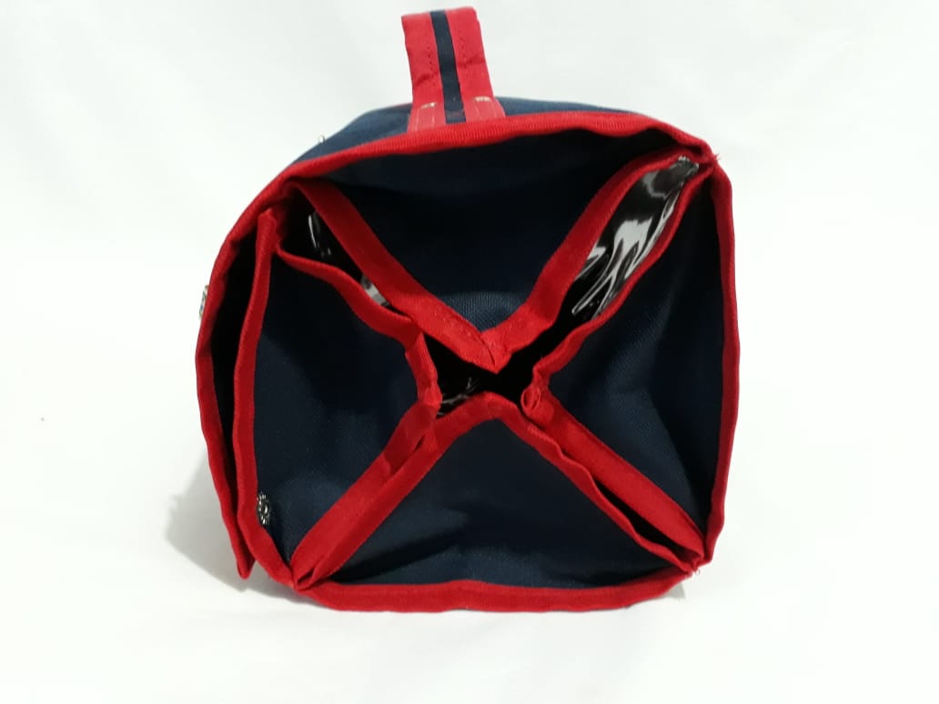 Tecido marinho, detalhe vermelho, bordado logo branco e nome vermelho